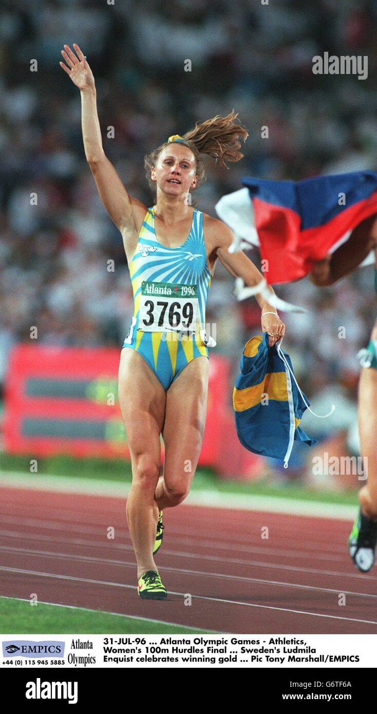 31 Jul 96 Atlanta Olympic Games Athletics Women S 100m Hurdles Final Sweden S Ludmila Enquist Celebrates Winning Gold Stock Photo Alamy